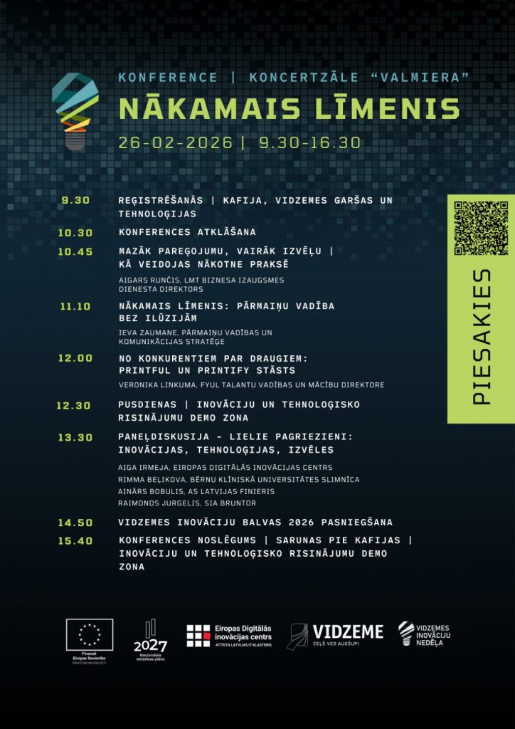 Šī gada 26. februārī notiks Vidzemes inovāciju nedēļas konference “Nākamais līmenis”. Tā norisināsies koncertzālē “Valmiera” un vienuviet pulcēs uzņēmējus, dažādu nozaru profesionāļus, publiskā sektora pārstāvjus, atbalsta organizācijas, inovāciju ekspertus un citus interesentus, kuri meklē praktiskus risinājumus izaugsmei un konkurētspējai.